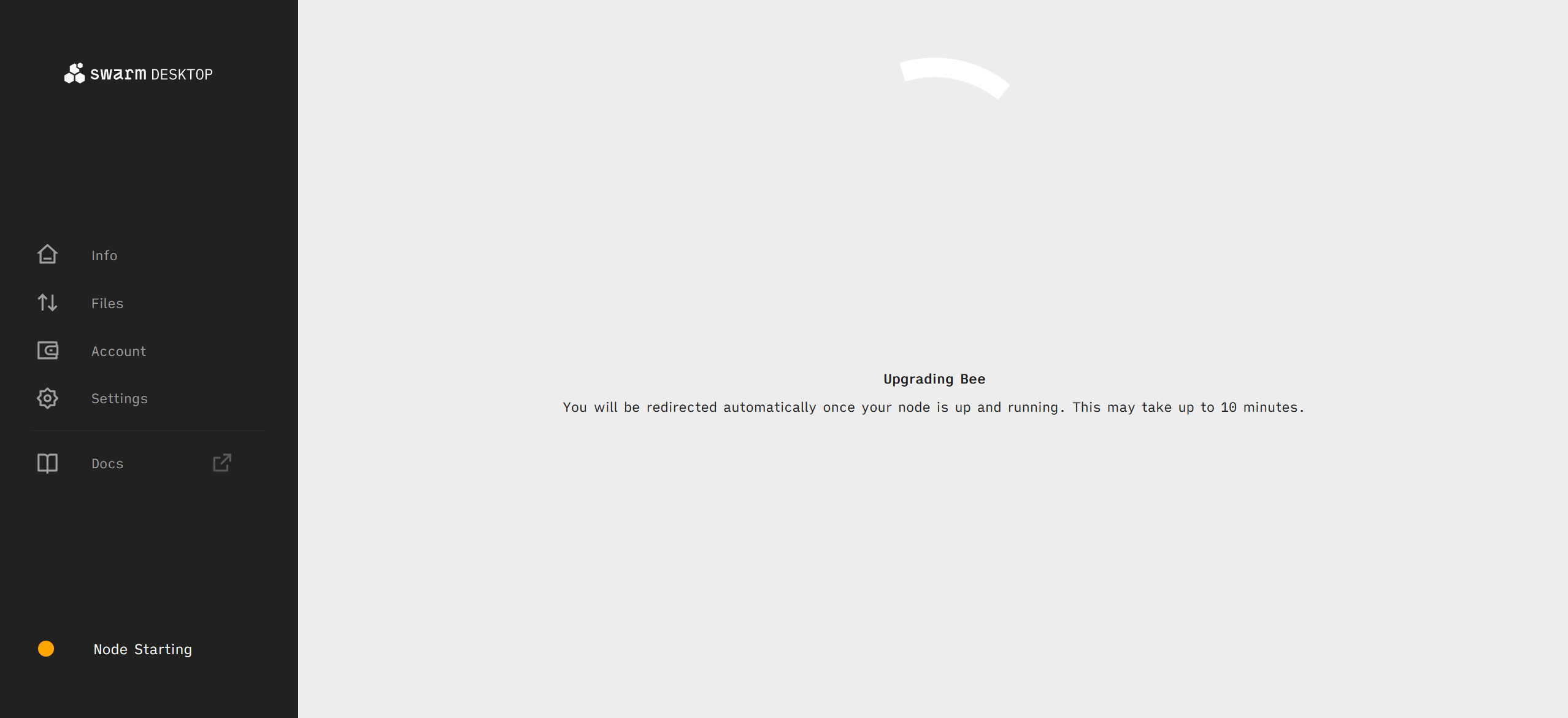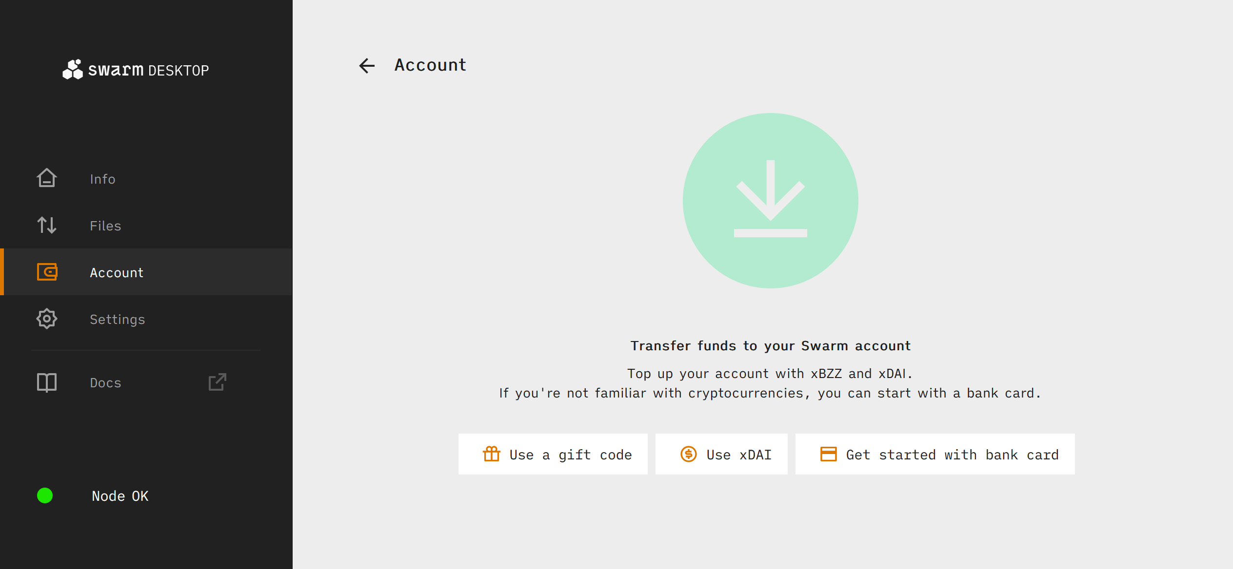 Bee ultra-light nodes are limited to only downloading small amounts of data from Swarm. In order to download greater amounts of data or to upload data to Swarm you must upgrade to a light node. To do this we need to first fund our Swarm Desktop Bee node with some xDAI (DAI bridged from Ethereum to Gnosis Chain which serves as Gnosis Chain's native token for paying transaction fees) in order to pay for the Gnosis Chain transactions required for setting up a light node.